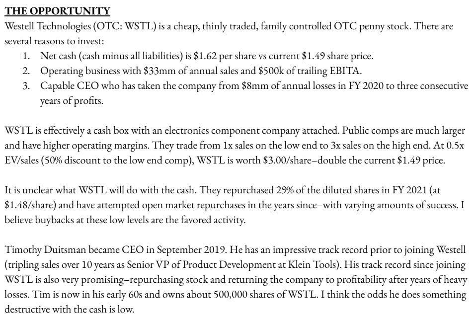 WSTL has since more than tripled in price. Operating results have been stronger than expected and the company has repurchased additional blocks of stock.