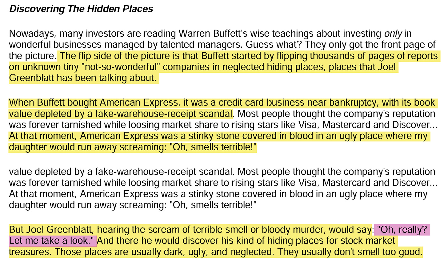 Since I’ve already mentioned Greenblatt, it would be a pity not to mention Buffett as well. And Brett Gardner’s book on Buffett's Early Investments probably captures this best: